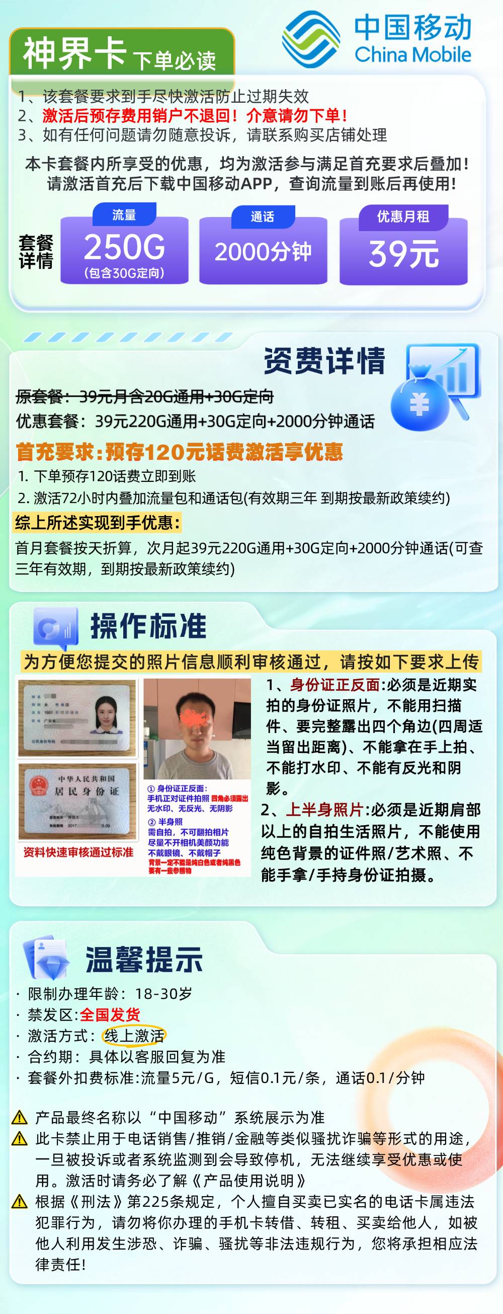 移动神界卡39月享250G+2000分钟【18到30岁办理】