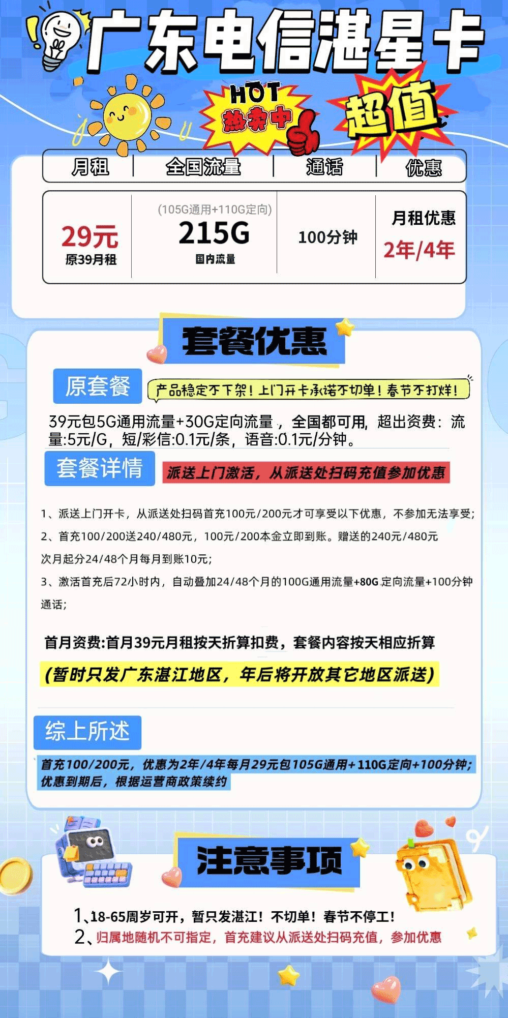 广东电信湛星卡29元月享215G+100分钟(只发湛江)