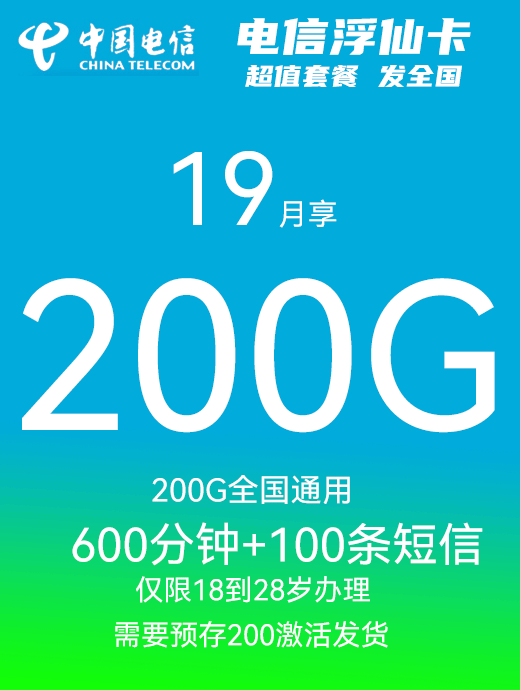 电信浮仙卡19元月享200G+600分钟通话+100短信【18-28岁办理】【两年一续】