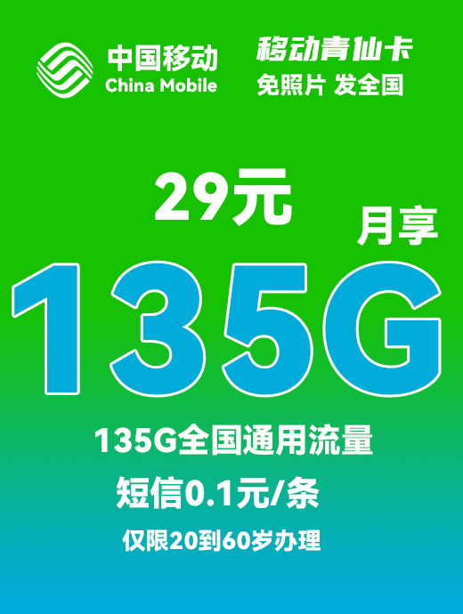 移动青仙卡29元月享135G流量【发全国】【北京新疆西藏也能发货】