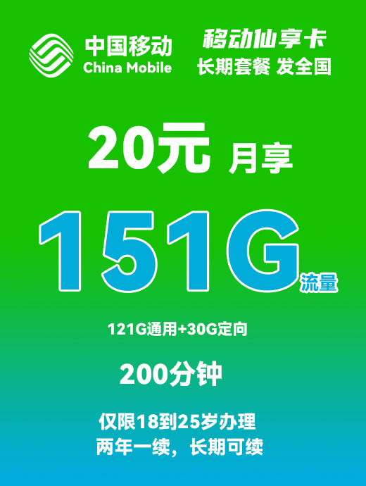 移动仙享卡长期20元月享150G+200分钟+100短信+长期视频会员n选1【18到25岁办理】【二年一续】