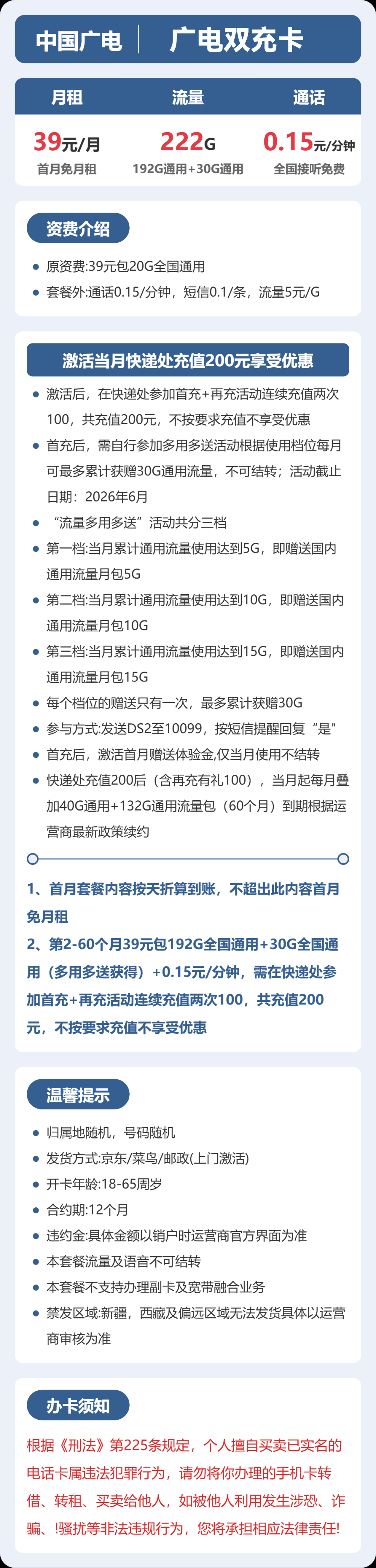 广电双充卡39元月享222G+0.15元/分钟【发全国 】