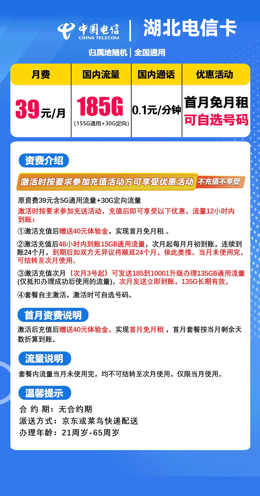 湖北电信39元185G+0.1元/分钟【长期套餐】【仅发湖北】
