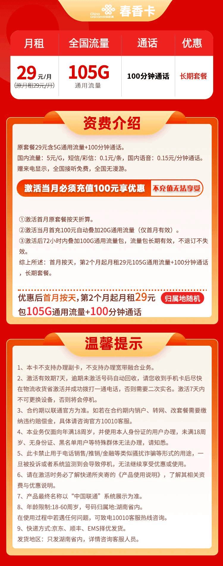 联通春香卡29元月享105G通用流量+100分钟通话【只发湖南省内】【长期套餐】