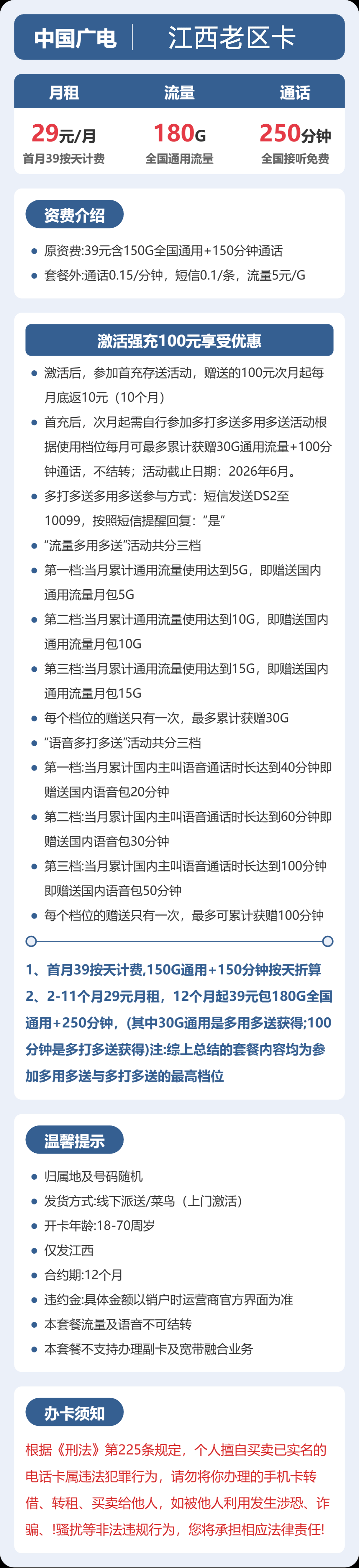 广电老区卡29元月享180G+250分钟【长期套餐】【优惠期后长期39】【仅发江西】【免费领取】