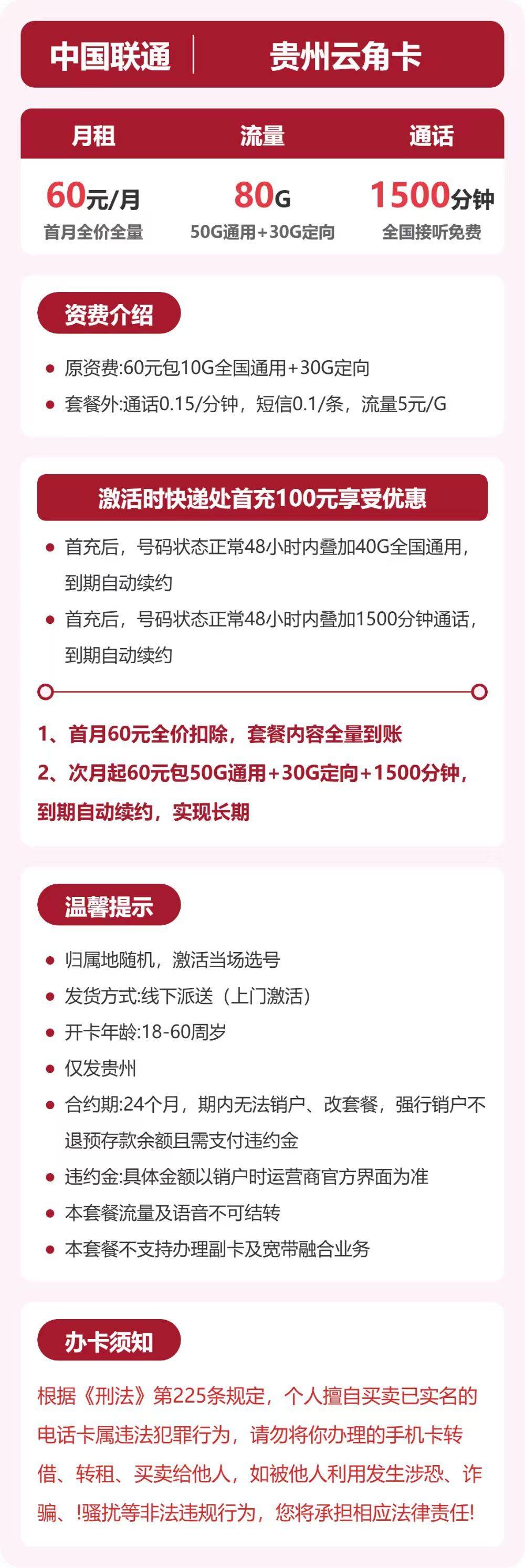 联通云角卡60元月享50G通用+30G定向+1500分钟通话