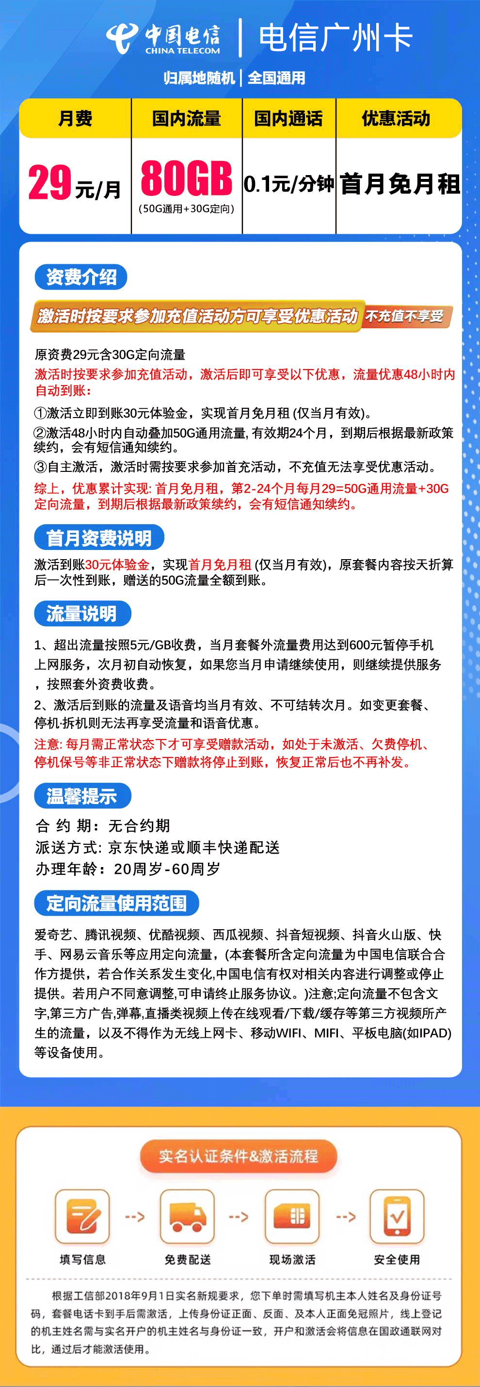 【免费领取发全国】广州电信29元月享80G+0.1元/分钟
