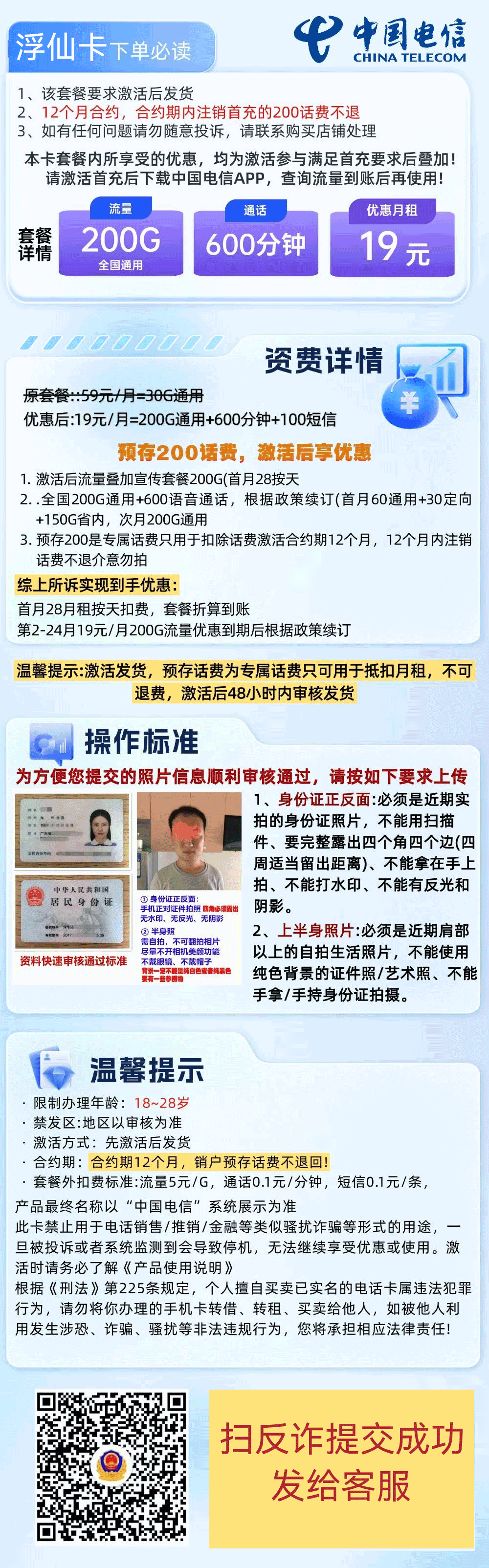 电信浮仙卡19元月享200G+600分钟通话+100短信【18-28岁办理】【两年一续】