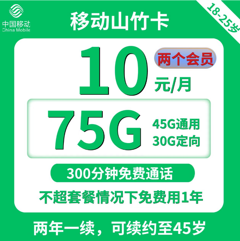 【0元预约 收费办理】移动山竹卡10元月享45G通用➕30G定向➕两个视频会员➕300分钟