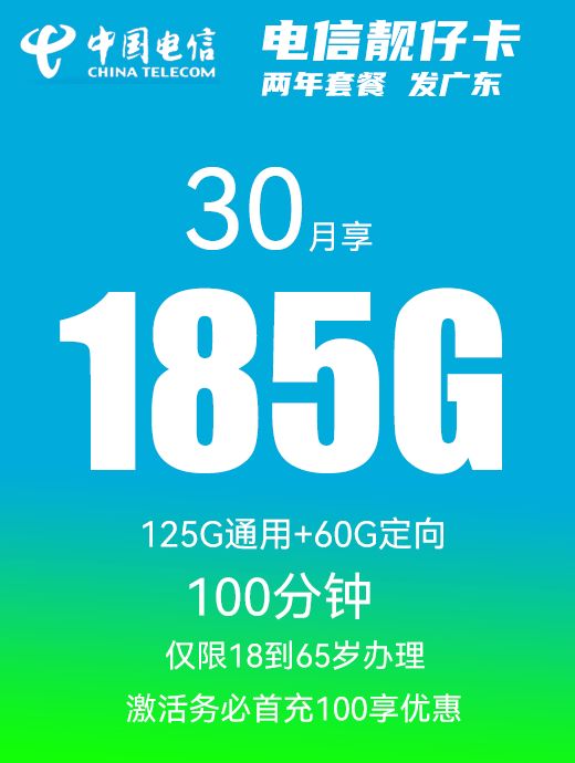 电信靓仔卡30元月享185G+100分钟【仅发广东】