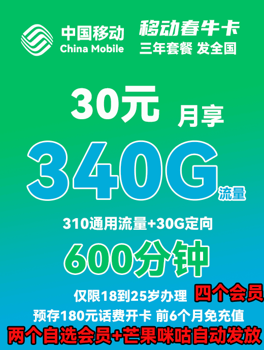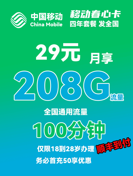 移动春天卡39元月享100G全国通用+100分钟+会员【长期套餐 发全国】【0元预约 收费办理】
