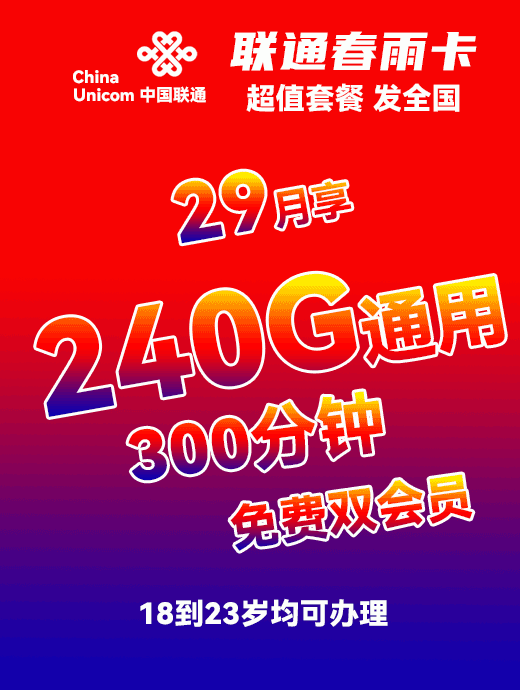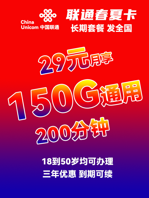 (18-75岁)全国发无禁区长期联通春色卡39元295G通用➕450分钟+可开副卡【0元预约 收费办理】
