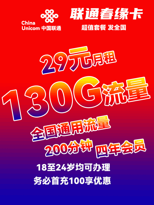 联通春游卡19元月享220G全国通用➕100分钟免费通话➕四年会员权益任选一,四年优惠(18-55)