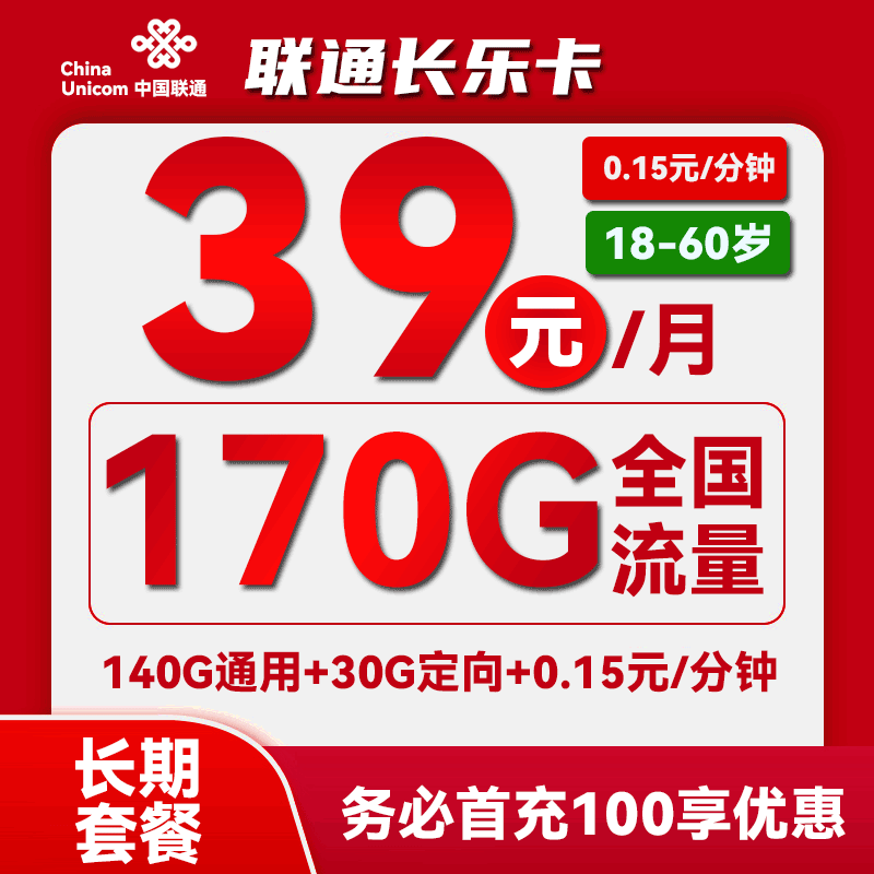 联通长乐卡39元月享170G+通话0.15元/分钟【长期套餐】【发全国】