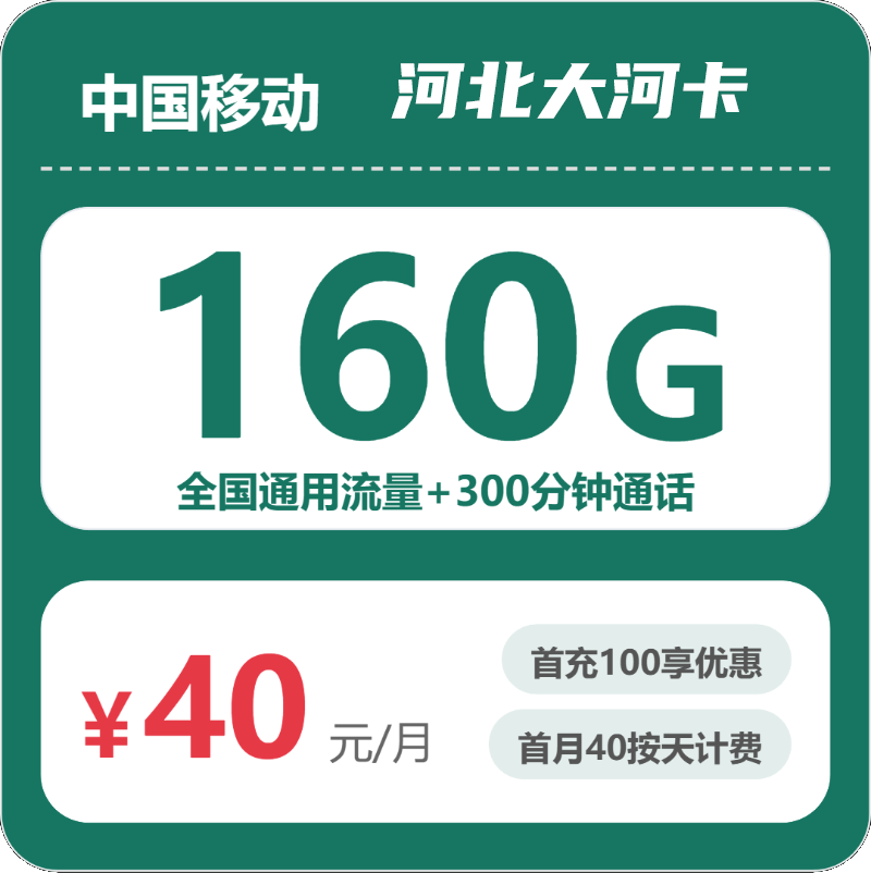 移动大河卡40元月享160G+300分钟【仅发河北】【长期套餐】