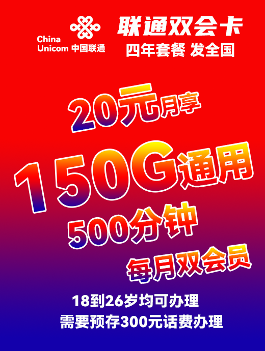 【下单后立即联系客服审核订单】联通时代卡20元月享180G通用+500分钟通话+会员【限16至26岁办理】