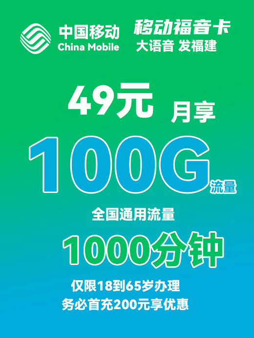 移动泉州卡49元月享100G+1000分钟【仅发泉州】