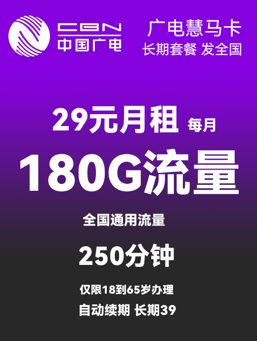 广电百马卡19元月享130G通用+200分钟通话【优惠期后长期29】