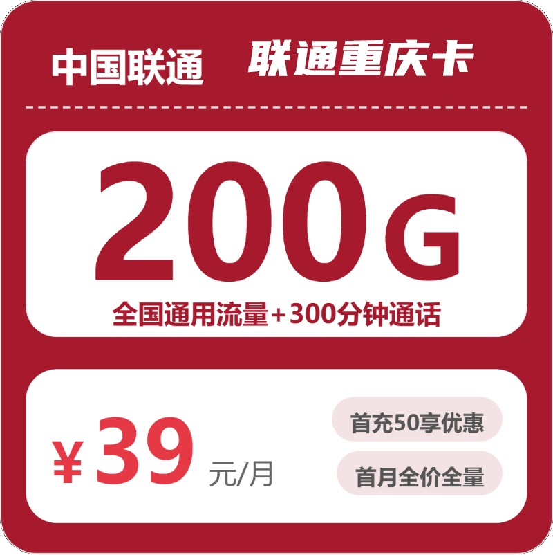 联通重庆卡39元月享200G+300分钟【长期套餐】【仅发重庆】