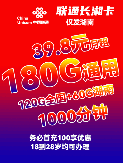 联通长湘卡39.8元月享180G通用+1000分钟通话【仅发湖南省】