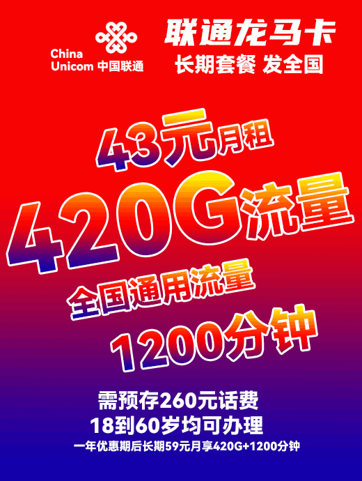 联通龙马卡43元月享420G全国通用流量+1200分钟+1张免费副卡【发全国】