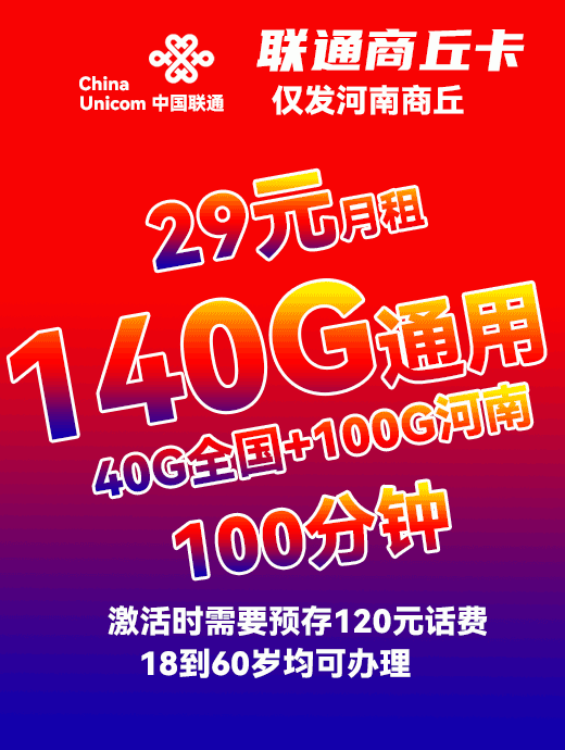 联通商丘卡29元月享140G通用+100分钟通话【仅发河南商丘】