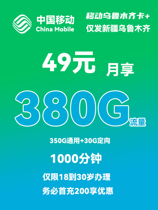 移动乌鲁木齐卡Plus49元月享380G+1000分钟通话【仅发新疆乌鲁木齐】
