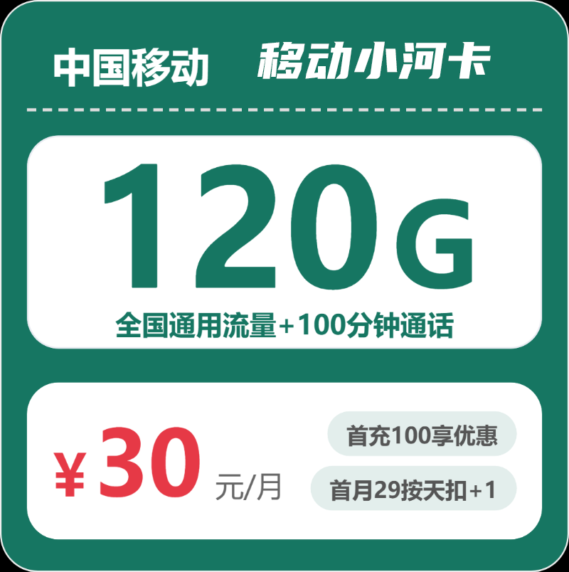 移动小河卡30元月享120G+100分钟【仅发河北】【长期套餐】