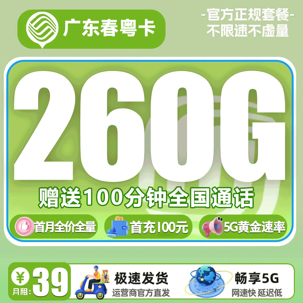 广东移动39元月享260G+100分钟【仅发广东】