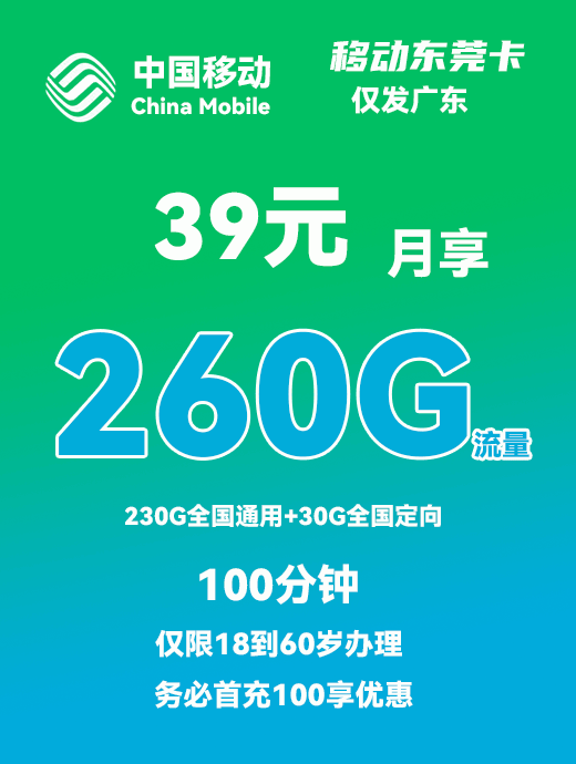 移动东莞卡39元月享260G+100分钟通话【仅发广东东莞】