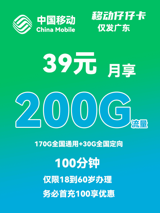 移动仔仔卡39元月享200G+100分钟通话【仅发广东省】