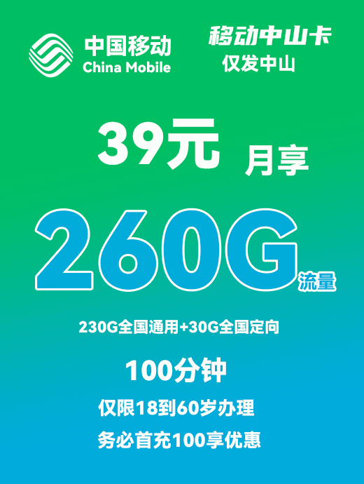 移动中山卡39元月享260G+100分钟通话【仅发广东中山】