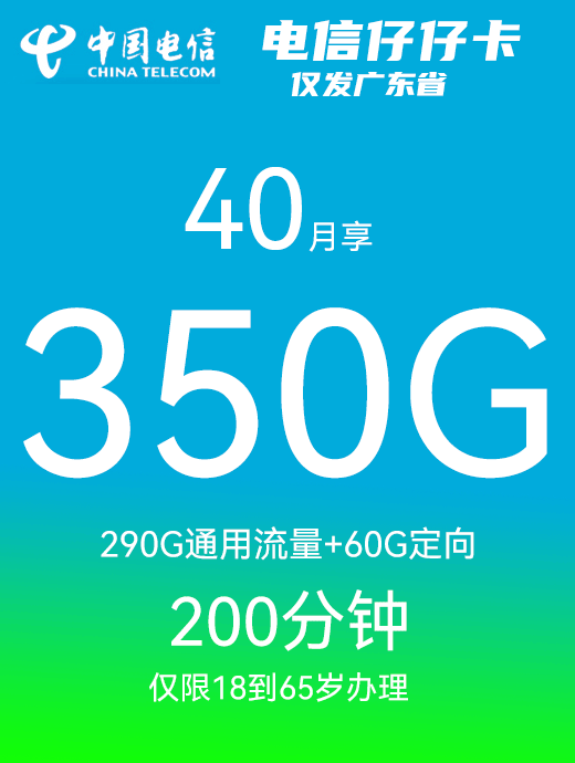 电信仔仔卡40元月享350G+100分钟【可发广东12市】【深圳 广州 惠州 佛山 东莞 中山 珠海 湛江 茂名 江门 汕尾等】