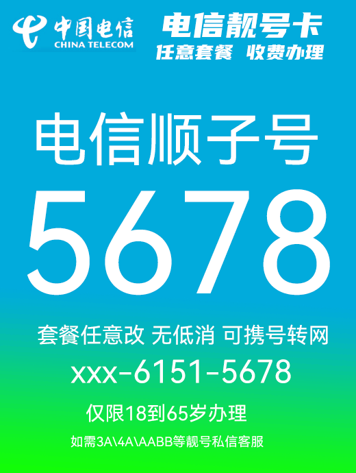 【0元预约 收费办理】电信靓号xxx-6151-5678【河北沧州电信】无低消-套餐任意改