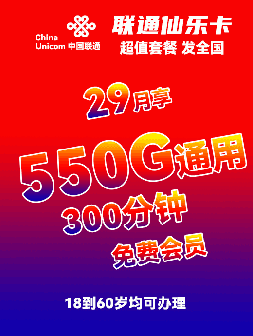 联通仙乐卡29元月享550G+300分钟+会员【18至60岁办理】【此版本每个月仅能领取一个会员】