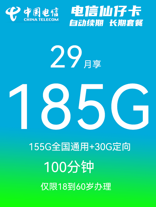 广东电信仙仔卡29元月享185G+100分钟【只发广东】
