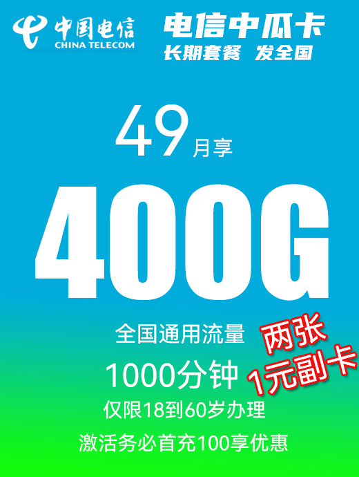 电信中瓜卡49元月享400G+1000分钟+两张1元副卡【长期套餐】【18至60岁均可办理】【流量全结转】