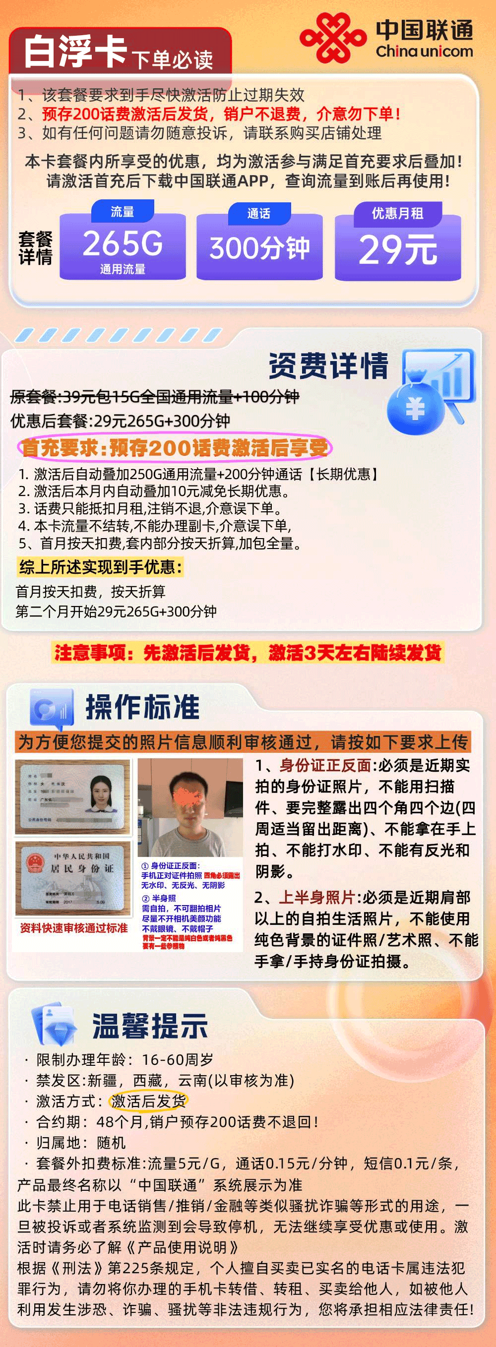 【0元预约 收费办理】联通白浮卡29元月享265G+300分钟【长期套餐 发全国】【18至60岁办理】