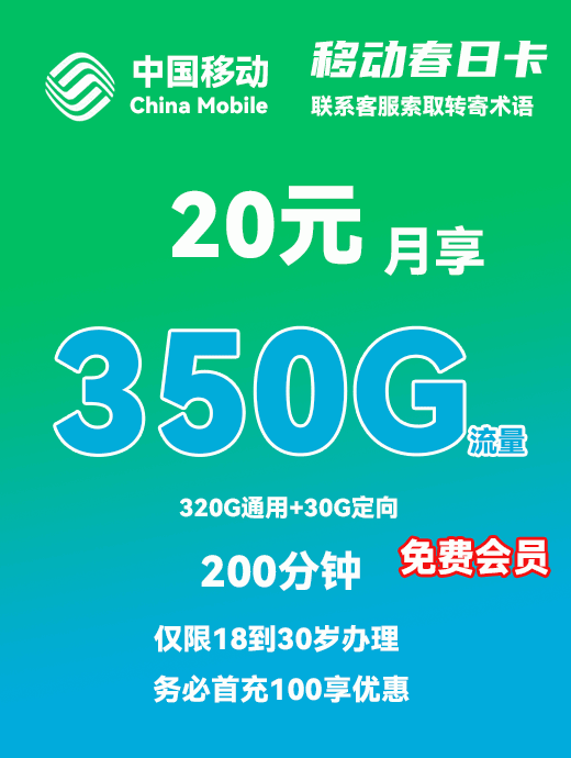 移动春日卡20元月享350G➕200分钟免费通话➕会员自选 1