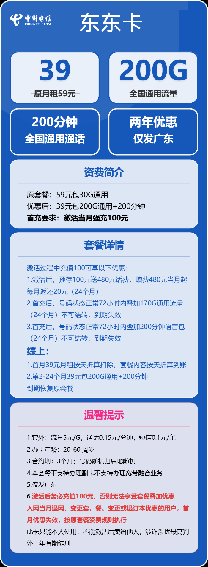 电信冬冬卡39元月享200G通用+200分钟通话【仅发广州、深圳、佛山、中山、惠州、东莞】