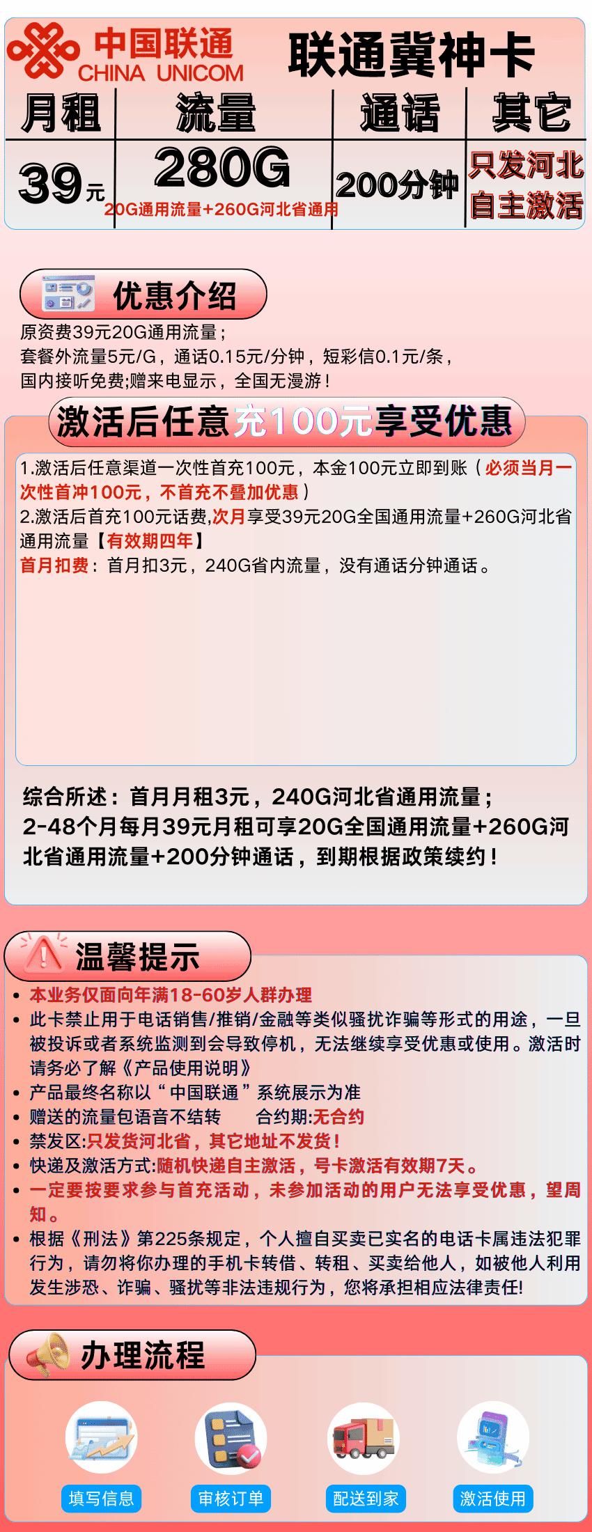 河北联通冀神卡39元月享280G通用+200分钟!仅发河北!不限年龄!