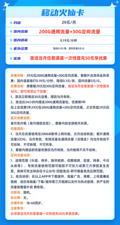 【上海移动】29元月享188G+50分钟