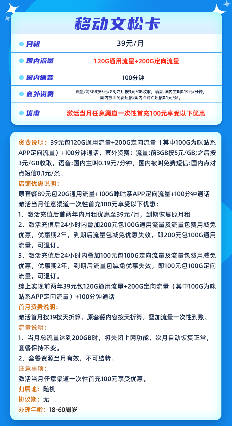 移动文松卡39元月享120G通用流量+200G定向流量(其中100G为咪咕系App定向流量)仅发浙江