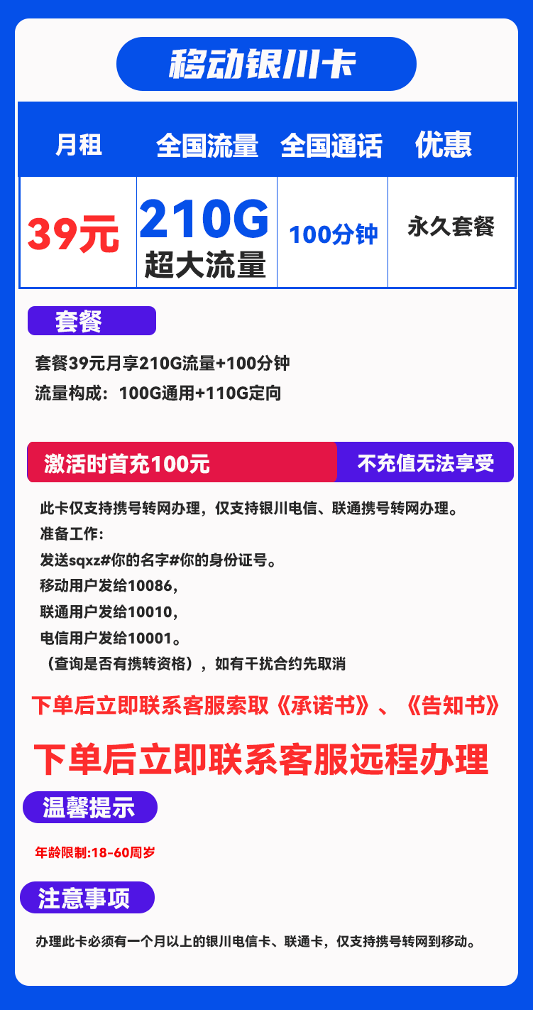 【延期 联系客服预约】移动宁夏银川39元月享210G+100分钟【长期套餐 仅支持银川电信联通携号转网办理 远程办理】