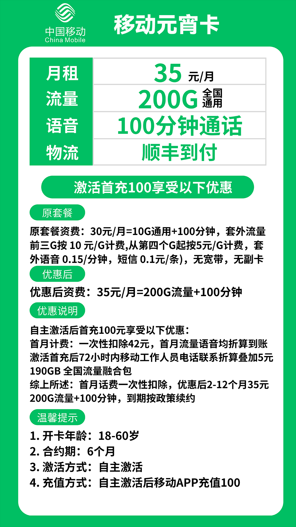 移动元宵卡35元月享200G通用+100分钟(18-65岁,顺丰到付)