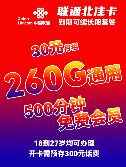 联通北洼卡30元月享260G+500分钟+会员【到期可续长期套餐】