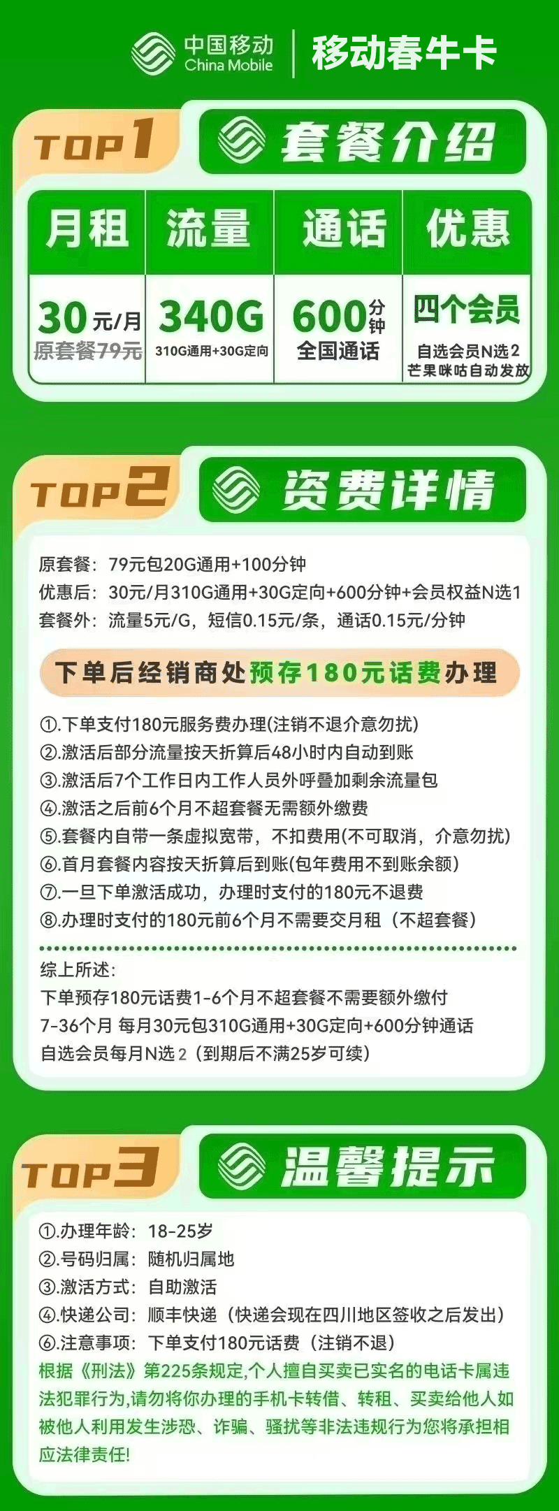移动春牛卡30元月享340G+600分钟+四个会员【仅限18到25办理】【到期未满25可以续期】