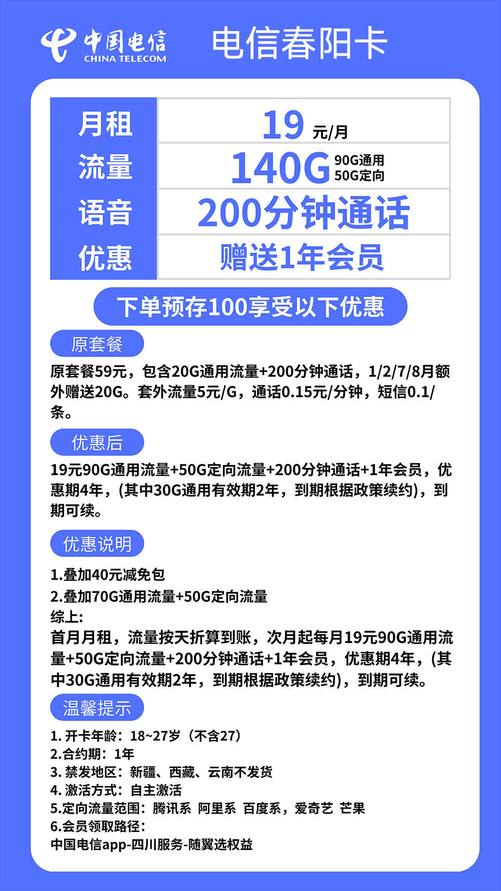 (18-27岁)四年电信春阳卡19月享元140G(90G通用+50G定向)+200分钟+1年视频会员N选1(到期可续)