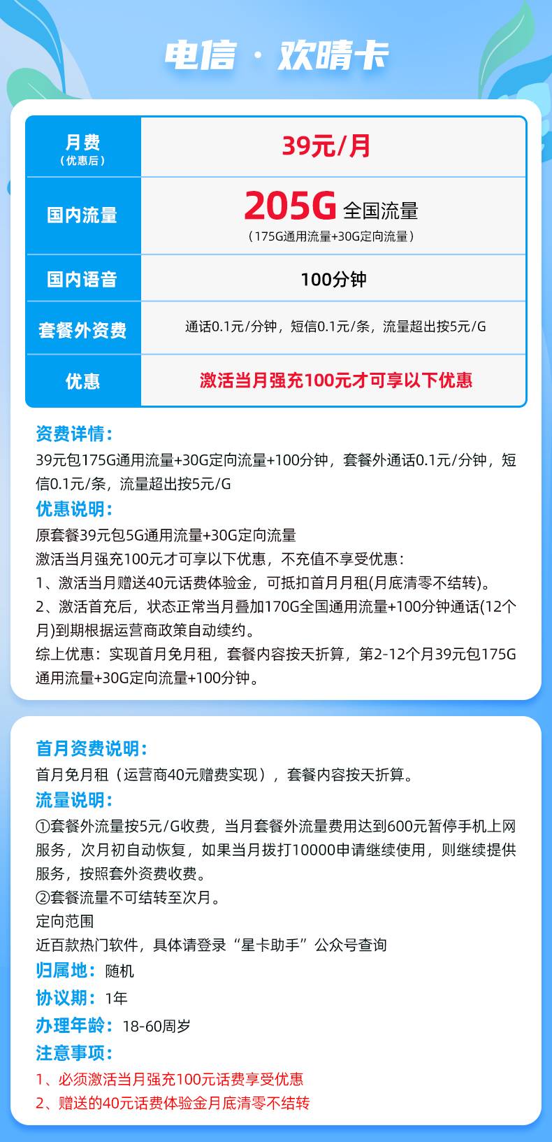 电信欢晴卡39元包175G通用流量+30G定向流量+100分钟(仅发广东省)