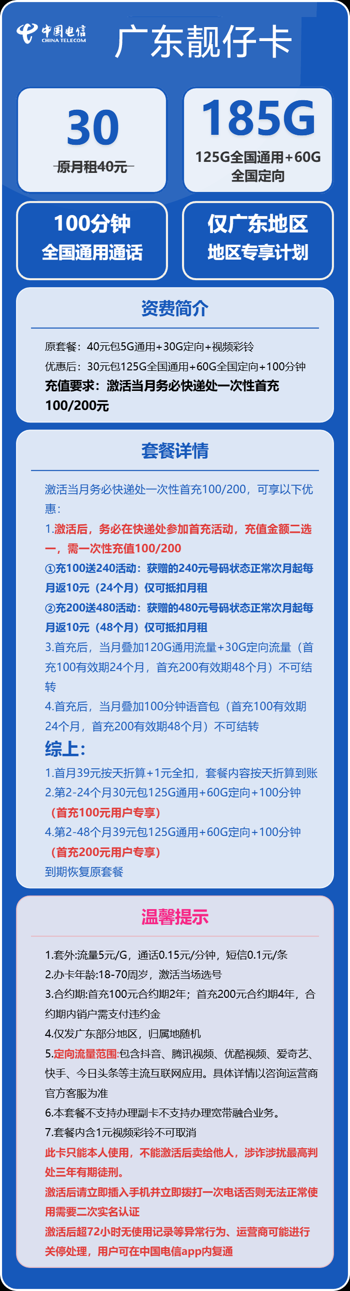 电信靓仔卡30元月享185G+100分钟【仅发广东】